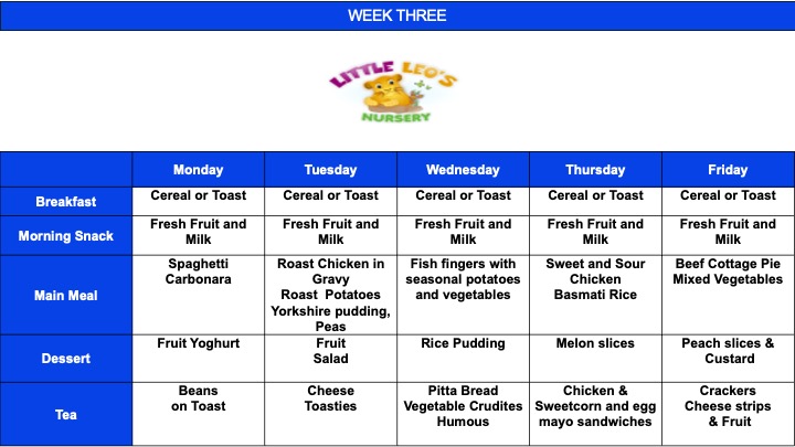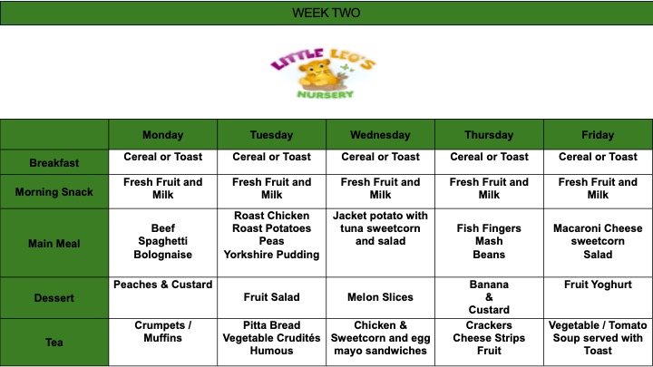 At Little Leo’s nursery we know and understand how vital good nutrition is for young children – we are proud to serve every child with freshly prepared food from our carefully designed 3-week menu cycle. These menus are nutritionally planned, balancing food groups, appropriate portion sizes, salt and sugar intake. Our yummy dishes also provide children with a rich variety of textures and tastes, offering a balance of carbohydrates, colourful vegetables, proteins, pulses and fresh fruit throughout the week. Meal times are a great opportunity for nursery practitioners to bond with your child – these are sociable learning opportunities where we teach the children about good manners, and encourage them to feed themselves independently. All cultural backgrounds, dietary requirements and food allergies of every child are respected and we work closely with all parents / carers to ensure that their child's needs are catered for.